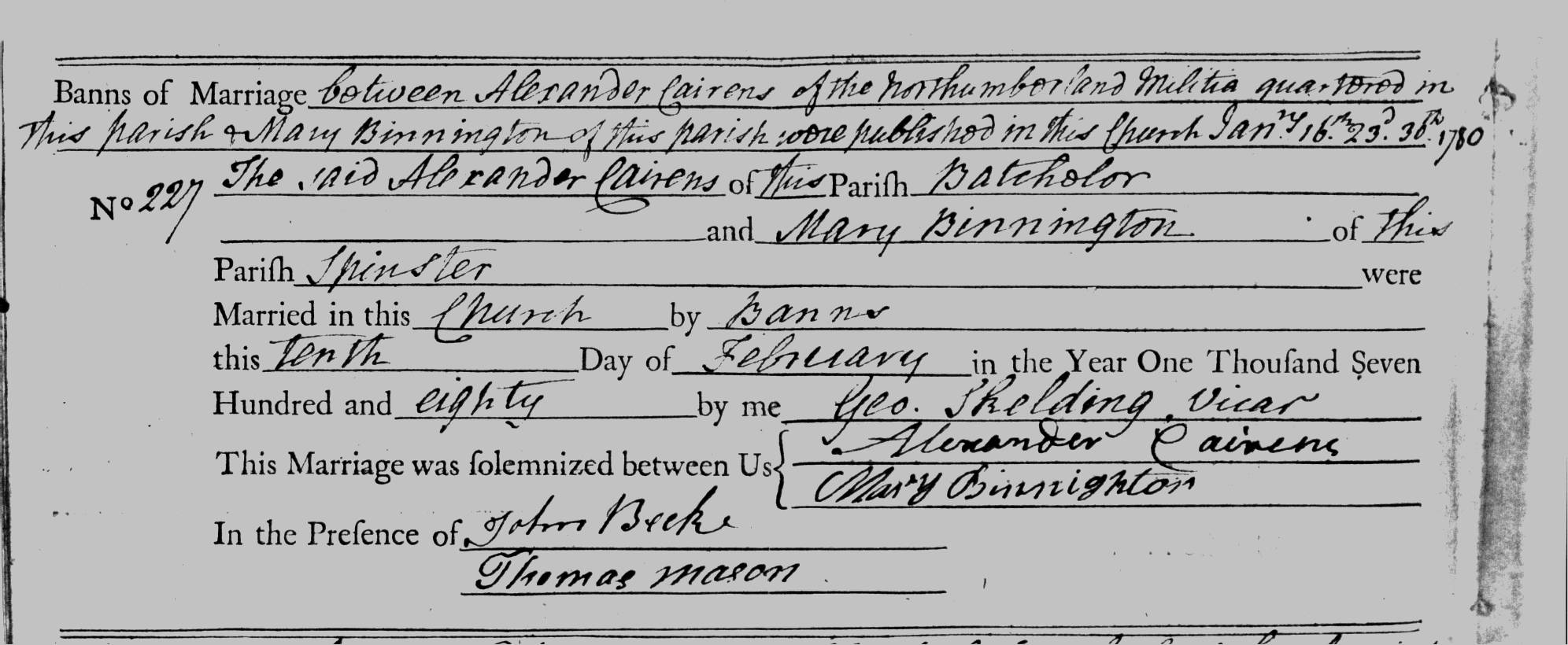 Alexander Cairens married Mary Binnington on 10th Feb 1779 at Market Weighton (although the IGI index say it was at Shipton by Thorpe). In the marriage banns he is described as "of the Northumberland militia, quartered in this parish", but in the marriage record he is described as a labourer. (So banns of marriage can give useful information).