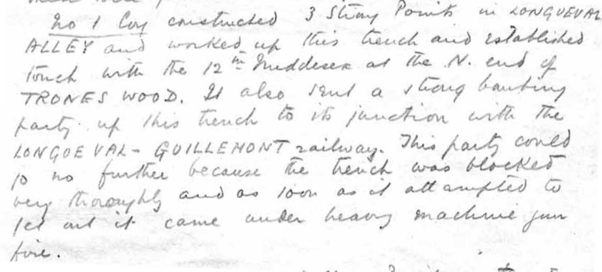 On the 14th, John Daly's number 1 company were ordered up Longueval Alley to NE corner of Bernafay Wood. There is a full description of 1 company activity during the 14th :-