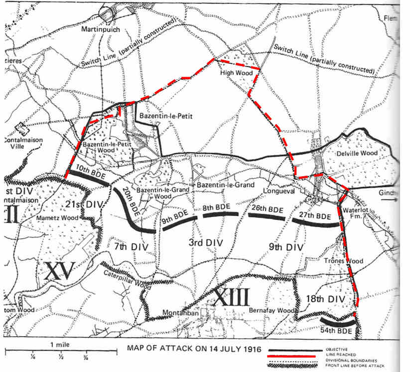 A major set-piece battle was planned for the 14th, advancing north to the ridge running from the Bazentin villages to Longueval and Delville Wood. ( Before this, it was neccessary to capture Bernafay Wood and Trones Wood on the right flank. After 7 unsuccessful attacks from the 8th to 13th, Trones Wood was finally captured by the 18th division on the 14th July. The 53rd brigade were not involved in this attack.).