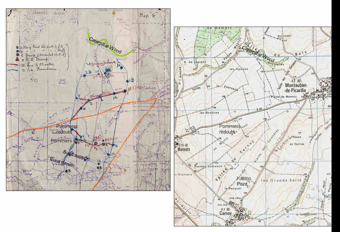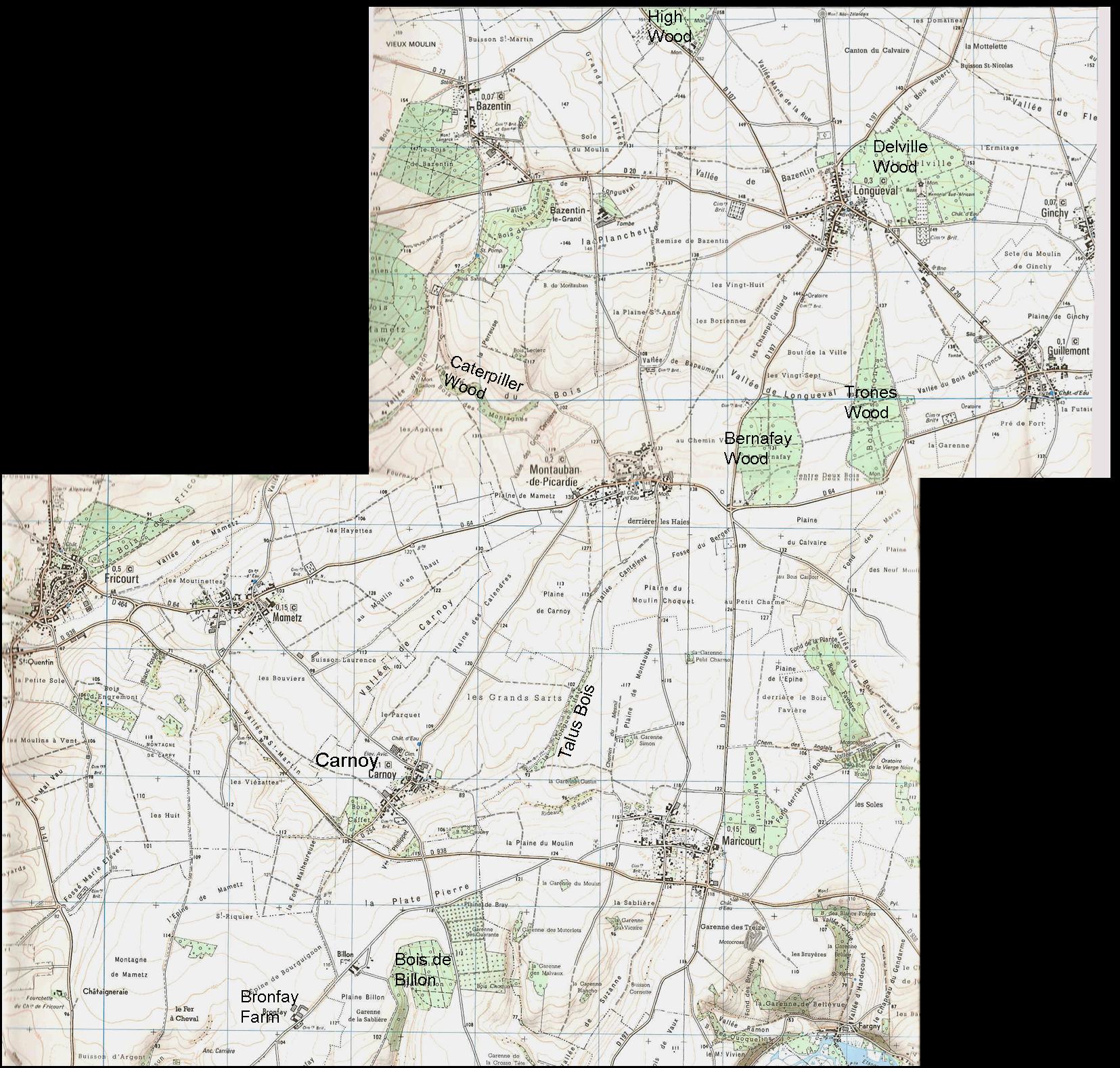 The battalion held the line until the 7th when they were relieved and sent back to Bronfay farm, then to Grovetown camp some 4km SW of Carnoy ( just south of the modern airfield) until the 14th.
