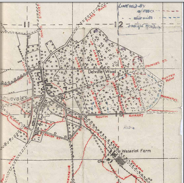 In the early morning of 19th July l0/Essex received urgent orders to report to Brigade Rendezvous in Caterpillar Valley, this order coming after two days of orders and cancellations. By 4.30pm the Battalion lay in artillery formation on the right of the Montauban-Longueval road near Bernafay Wood. At 5.00am further orders confirmed that 10/Essex had been loaned to 9th Division to retake Longueval and Delville Wood.
