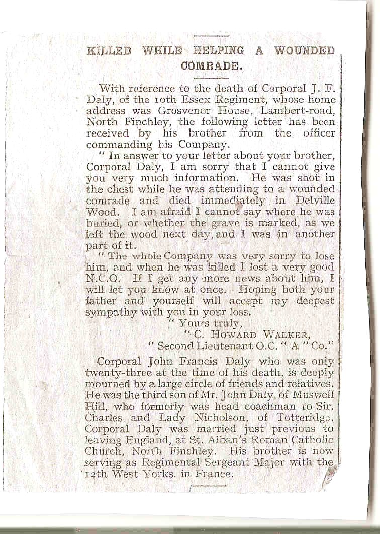 John Daly was born in December 1893 in London, the third and youngest son of John and Ceilia Daly. In the 1911 census he was living with his widowed father at 21 Lichfield Grove, Church End, Finchley, and was working as a shop assistant at a provisions merchant.