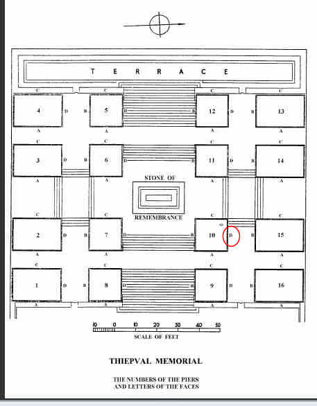 remembered on the Thiepval memorial, at Pier 10, Face D.